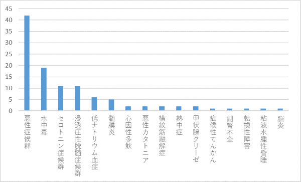悪性症候群が最多であり,水中毒,セロトニン症候群,浸透圧性脱髄症候群と続きました.
