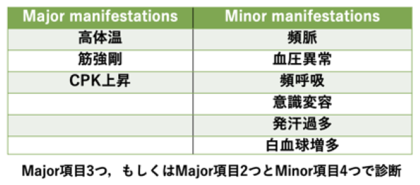 またこれまでに発表された診断基準のうち,頻用されるものにLevensonのものがあります(表2)12) .今回の症例では来院時点でMajor manifestationsのいずれも該当しませんが,入院後の経過ですべてを満たしたため診断に至りました.初診時には診断基準を満たさないこともあるため,疑わしい薬剤を内服している患者の意識障害では悪性症候群を念頭に置く必要があります