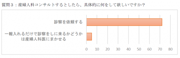 依頼したい診察の内容としてはNST(CTG)、経腹/経膣エコー、内診などで、胎児のwell-being評価、羊水量/破水/性器出血の有無、常位胎盤早期剥離の有無、子宮収縮/子宮内血腫の有無、頚管長/胎盤の位置の確認をしてもらいたい、という回答がほとんどでした。