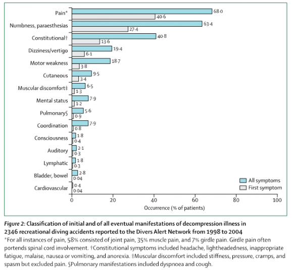 下図(図1)は減圧病(Decompression illness)の初期症状と全ての症状のグラフです。